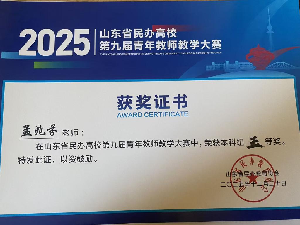 近日,山东省民办高校第九届青年教师教学大赛圆满落幕。我院青年教师孟兆芬凭借扎实的专业功底、精湛的教学设计和出色的现场表现,在激烈角逐中脱颖而出,荣获本科组三等奖,充分展现了我院青年教师的风采与实力。
